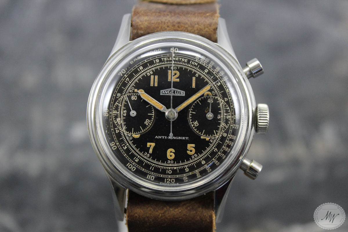 Angelus Chronograph with Caliber 215 in very good condition from the 50´s. The wonderful case shows only minor signs of wear. Dial and hands set are overall in very good and untouched condition with some light signs of aging. The movement (cal. 215) has just received a complete service and is working perfectly well.