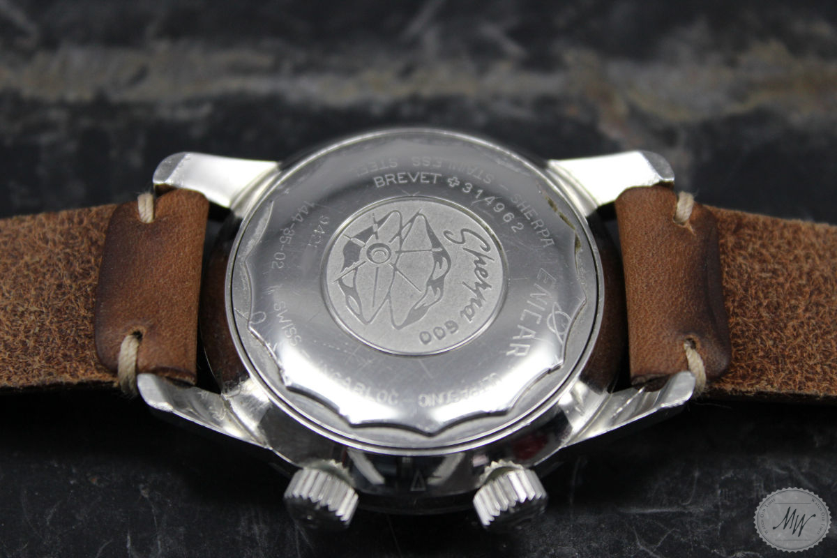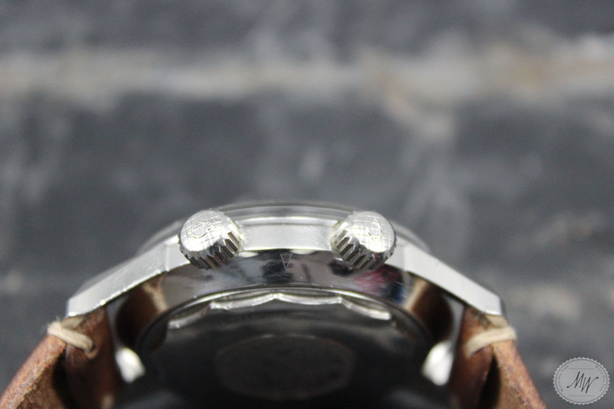 Enicar Sherpa Super Dive Ref. 144-35-02 in sehr gutem und komplett unangetastetem Originalzustand aus 1966. Das unpolierte Gehäuse hat nur geringe Tragespuren und alle Gravuren auf dem Rückdeckel sind einwandfrei lesbar. Das wunderschöne Zifferblatt und das Zeigerspiel haben eine wunderschöne Patina und sind sehr gut erhalten. Die Servicehistorie ist nicht bekannt, aber das Werk (AR 1145) wurde gerade von meinem Uhrmacher durchgesehen und läuft absolut einwandfrei.