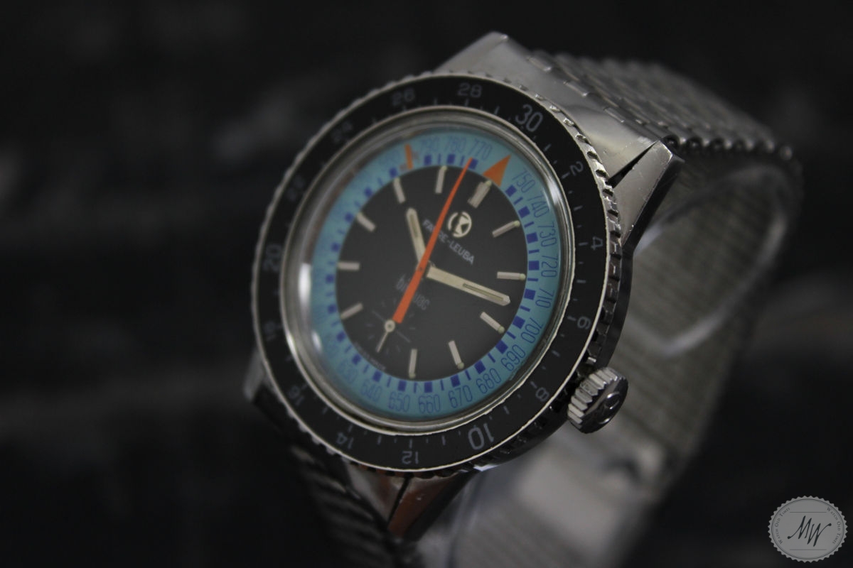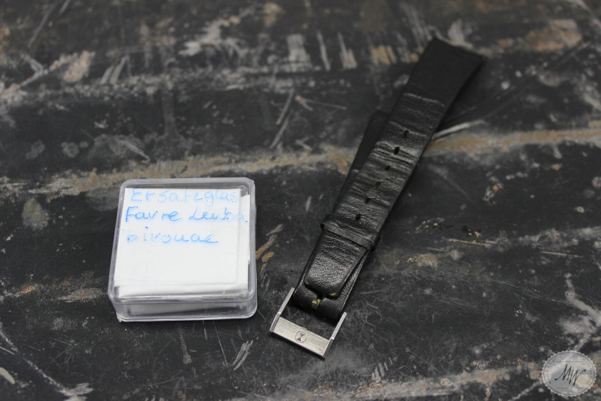 Seltene Favre Leuba Bivouac Ref. 53203 aus den 60er Jahren in unangetastetem sehr gutem Zustand. Das Gehäuse hat nur geringe bis normale Tragespuren. Das wunderschöne blaue Zifferblatt und Zeigerspiel sind makellos und haben eine fantastische Patina. Das montierte NSA / Favre Leuba Stahlband befindet sich in sehr gutem Zustand (die Endstücke sind auf das Gehäuse angepasst worden). Das originale Lederband mit Schließe ist auch noch vorhanden und auch ein sehr seltenes Originalglas ist auch noch dabei. Die genaue Servicehistorie ist nicht bekannt, aber das Werk (Peseux 320) wurde gerade von meinem Uhrmacher durchgesehen und läuft absolut einwandfrei.