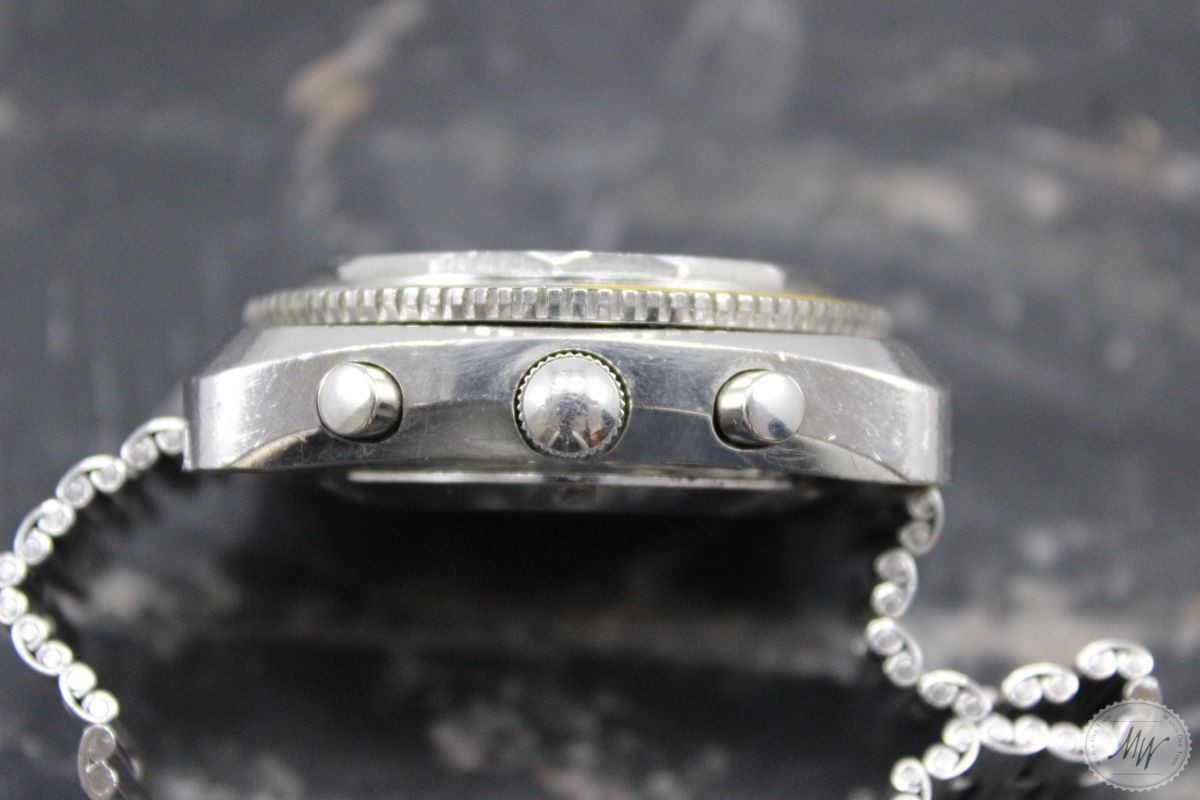 Super seltene Favre Leuba Sea Sky GMT Ref. 33053 aus den 70er Jahren in getragenem, aber unpoliertem und unangetastetem Zustand. Das Gehäuse hat deutliche Tragespuren, aber keine tiefen Kratzer oder Kerben. Die Aufzugskrone ist bereits ersetzt worden. Das ehemals blaue Zifferblatt hat sich in großen Teilen wunderschön goldfarben verfärbt, weißt aber ansonsten keine Beschädigungen auf. Das originale Zeigerspiel zeigt Altersspuren (siehe Bilder). Das korrekt NSA Stahlband befindet sich in gutem Zustand. Die Service Historie ist nicht bekannt, aber das Werk (Val. 724) wurden gerade von meinem Uhrmacher durchgesehen und läuft in allen Funktionen einwandfrei.