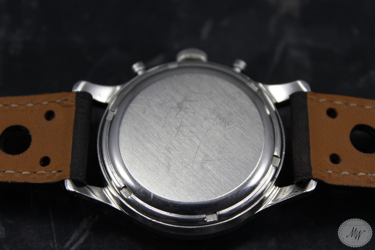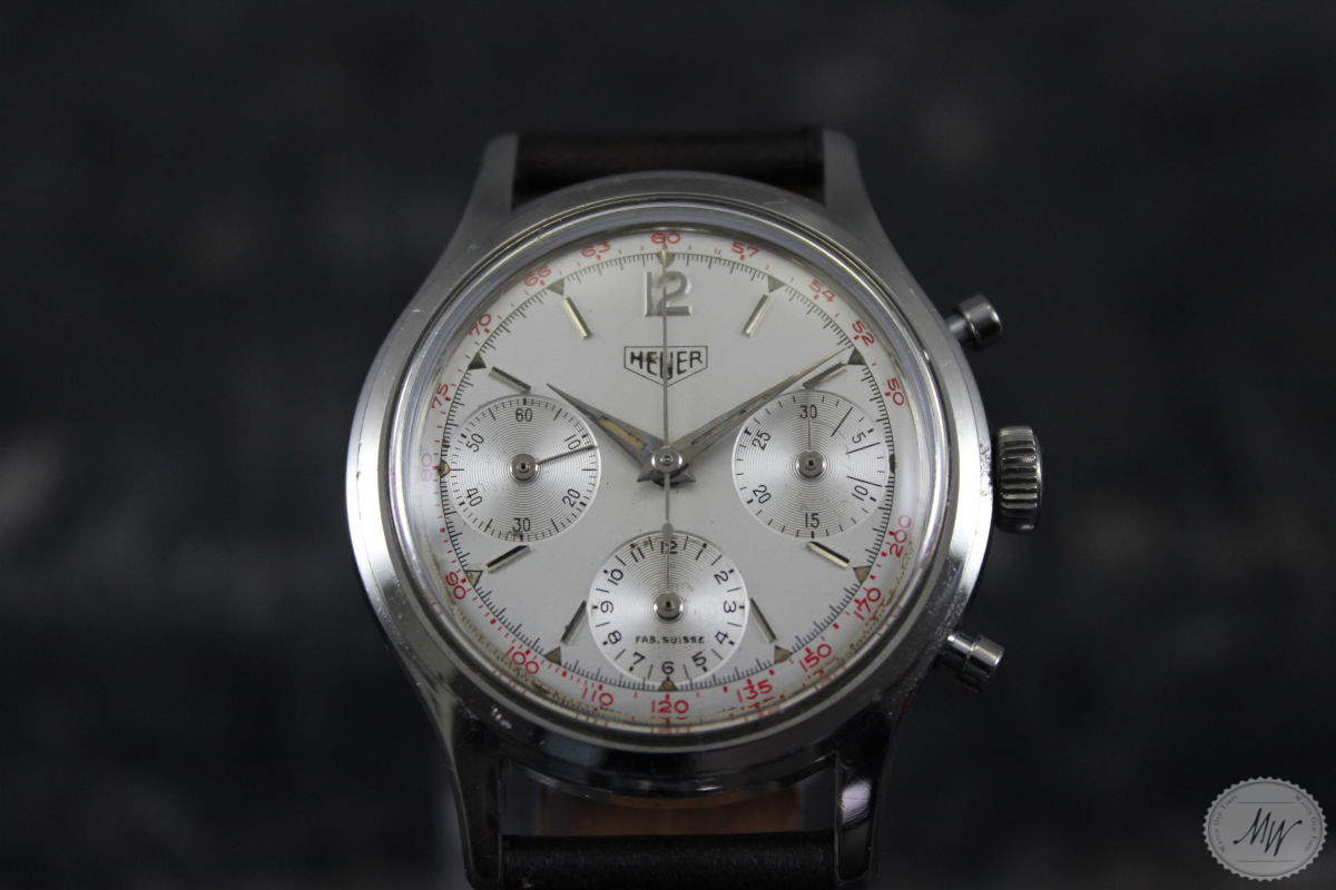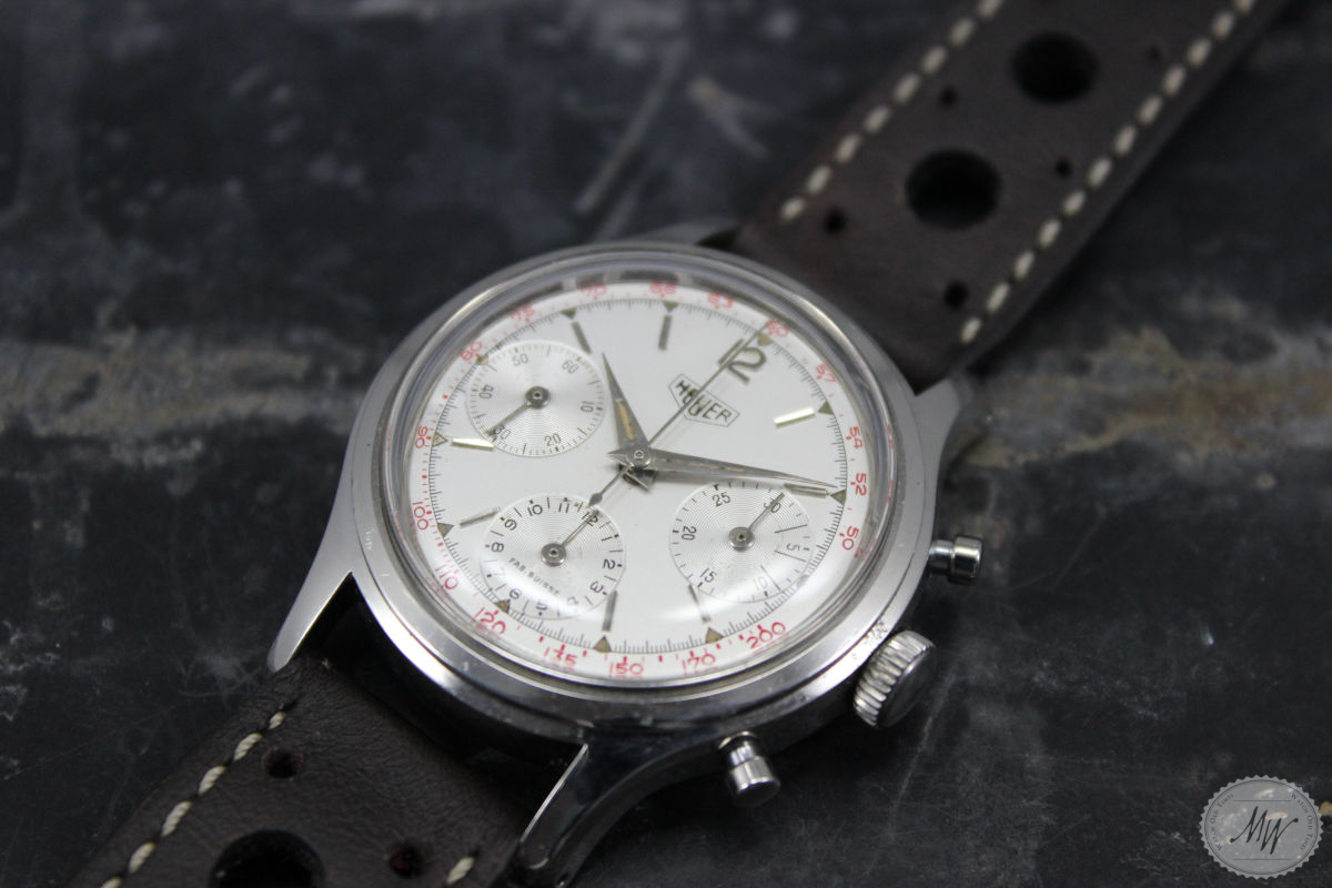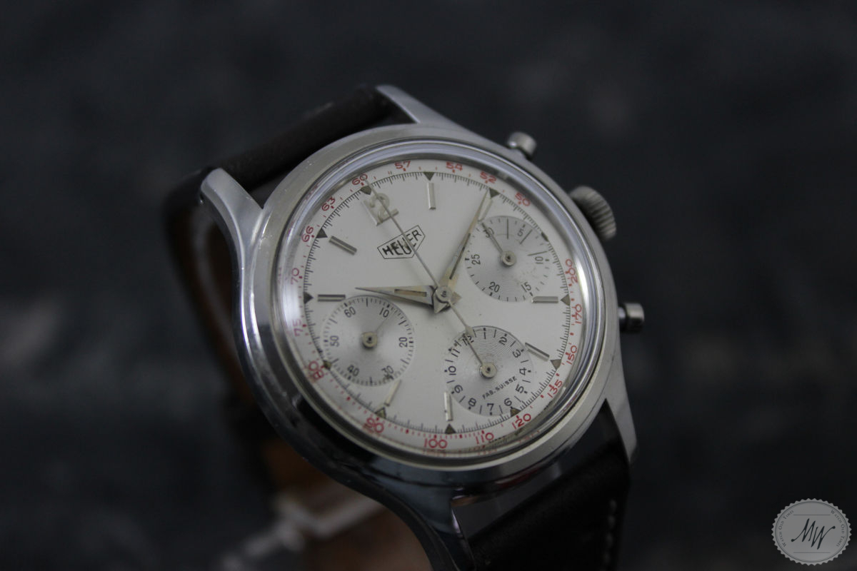 Heuer Pre Carrera Ref. 2444 im sehr schönen Originalzustand aus den 40er Jahren. Das Gehäuse befindet sich in sehr gutem Zustand mit minimalen Tragespuren. Das Zifferblatt und das Zeigerspiel sind für das Alter ebenso sehr gut erhalten und haben eine schöne Patina, zeigen aber die erwartbaren Altersspuren für eine Uhr dieses Alters. Die Servicehistorie ist nicht bekannt, aber das Werk (Val. 72) läuft in allen Funktionen absolut einwandfrei.