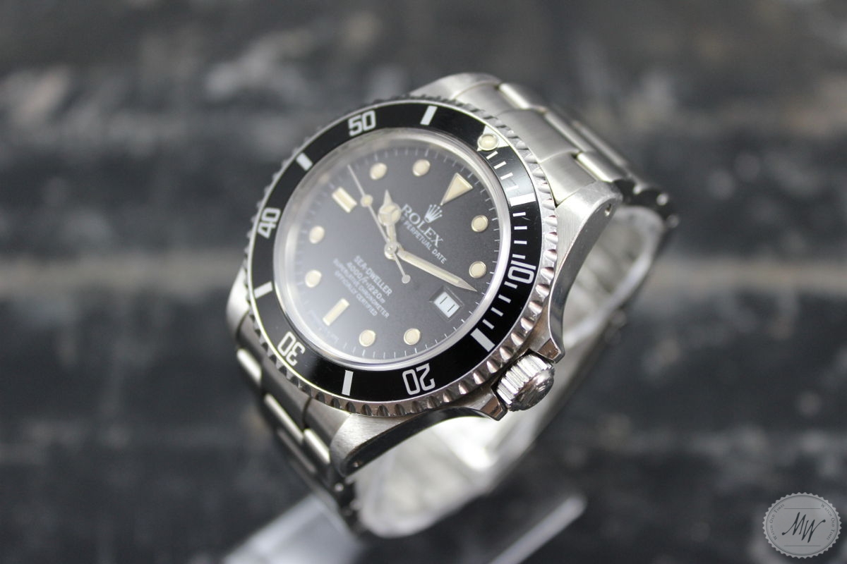 Komplett unpolierte Rolex Sea Dweller Ref. 16660 in sehr gutem Zustand mit nur erwartbaren Tragespuren. Das Zifferblatt glänzt nicht mehr, ist aber ansonsten in einwandfreiem Zustand mit herrlicher Patina und perfekt passendem Zeigerspiel. Das periodenkorrekte originale Stahlband (Ref.: 93160-592, J 4, 12 Glieder) ist ebenfalls in sehr gutem Zustand. Die Servicehistorie ist unbekannt, aber das Werk läuft absolut einwandfrei.