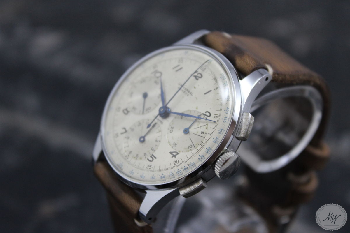 Seltener Universal Geneve Compax Chrono Ref. 32502 in sehr gutem und komplett originalem Erhaltungszustand von 1946. Das Gehäuse wurde gerade professionell überarbeitet und hat keinerlei Tragespuren. Das wunderschön erhaltene originale Zifferblatt zeigt die bei diesen Uhren eigentlich immer vorhandenen Altersspuren. Das wunderschöne Kal. 287 wurde gerade komplett überholt und läuft in allen Funktionen absolut einwandfrei.